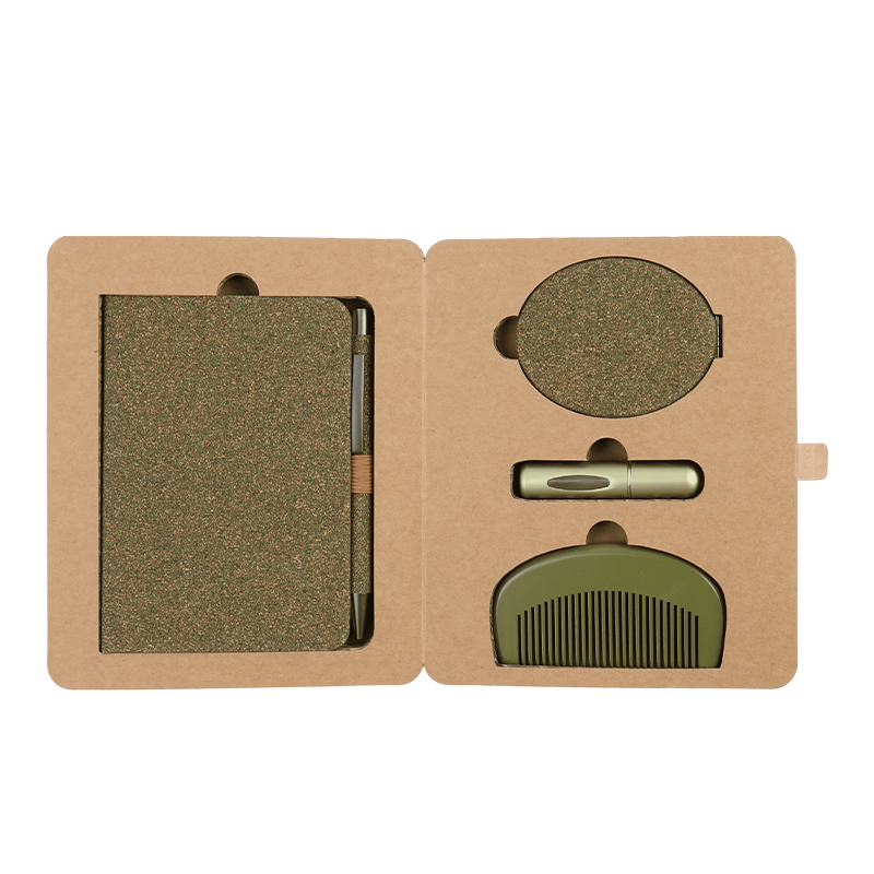 On the left side of the gift box, you’ll find a tea-waste A6 memo notebook featuring a textured green tea–fiber cover. Its warm, organic appearance is further complemented by a matching tea-cork ballpoint pen, offering a unique and tactile writing experience. Both items highlight the potential of repurposed agricultural waste—turning what would have been discarded into functional daily tools.