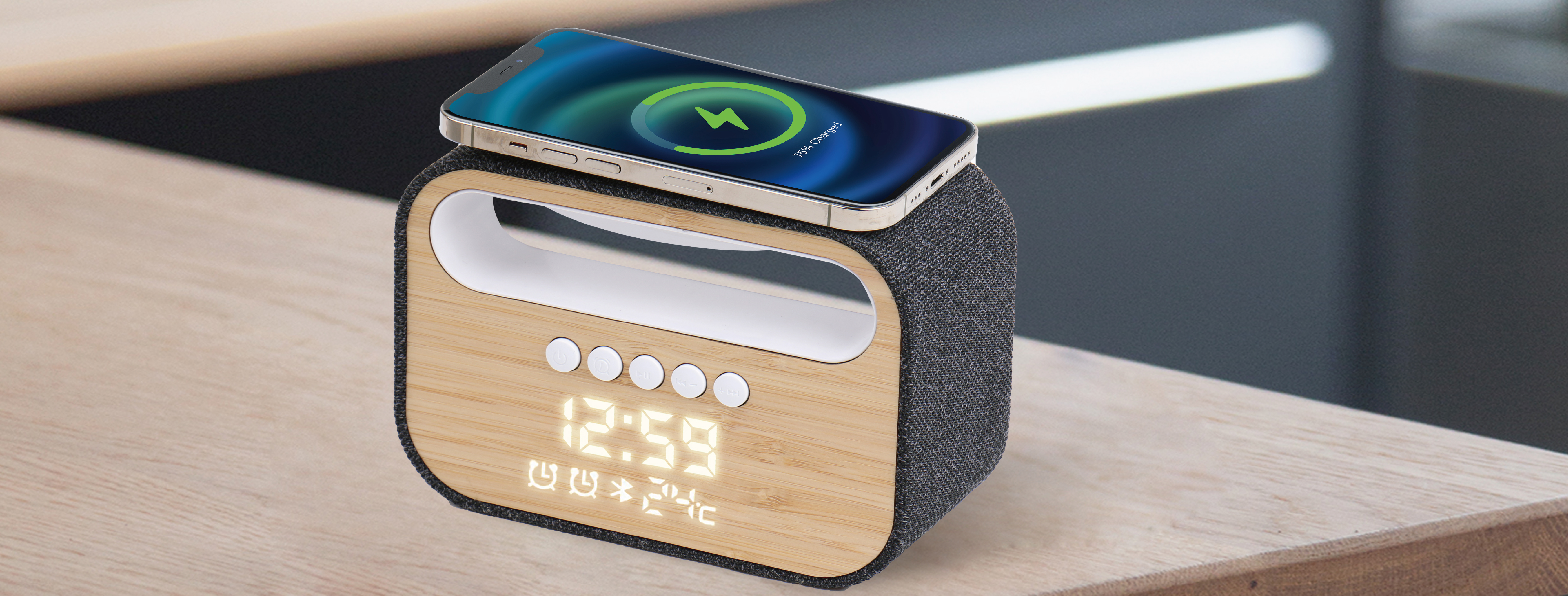 15-W-Schnellladung kabellos Nachtlicht mit 3 Modi, einstellbar Digitaluhr mit Temperaturanzeige 5-Watt-Lautsprecher mit ausgewogenem Klang Kompaktes Holz- und Stoffdesign USB-Typ-C-Eingang