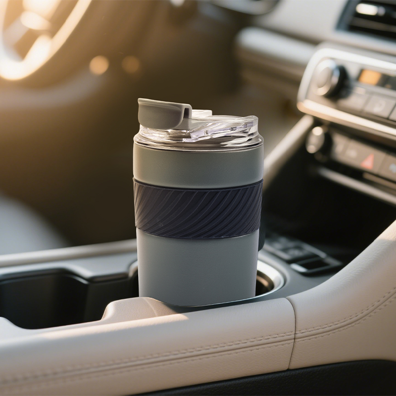 This 350ML insulated mug (14*7CM) features inner 304 and outer 201 stainless steel, a spray-coated surface, and a threaded silicone ring on the cup wall for anti-slip, easy holding.