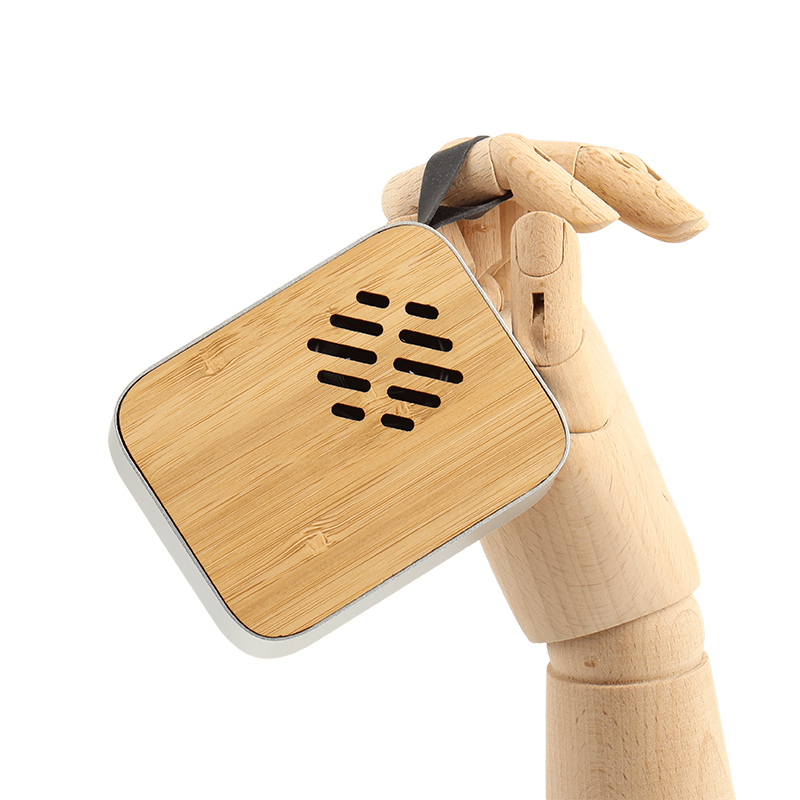 The K61 Portable Bluetooth Speaker combines a natural bamboo main body with a soft silicone base for stability and slip resistance.