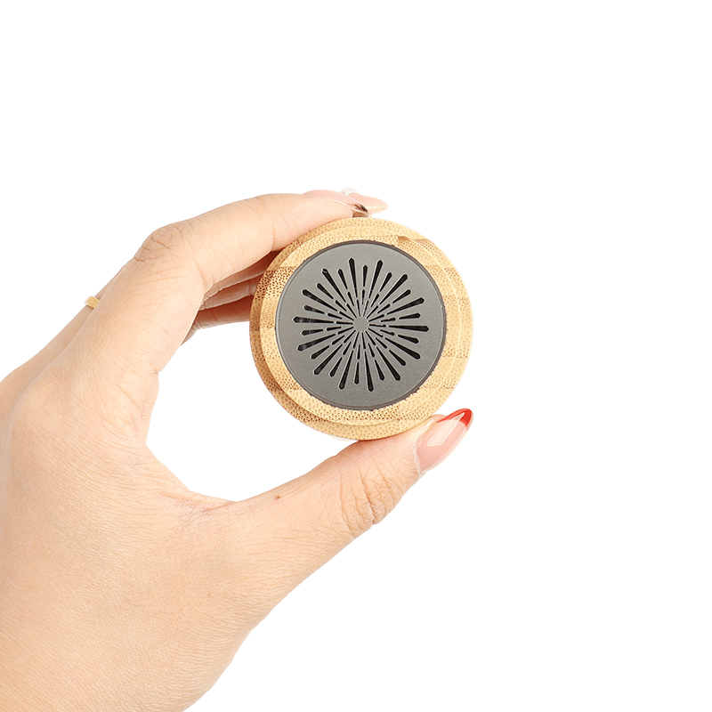 The Mini Portable Bluetooth Speaker (Model K62) combines a natural bamboo main body with a durable aluminum top.
