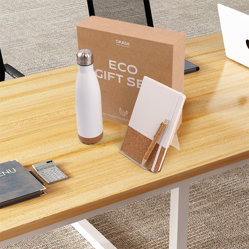 We pair recycled cotton (a waste-reduction choice) with renewable cork and long-lasting stainless steel, turning everyday moments (writing, hydrating) into mindful, earth-friendly rituals. This set balances sustainable material innovation with gentle tactile charm, linking brands and users through pieces that honor both the planet and comfortable daily living.