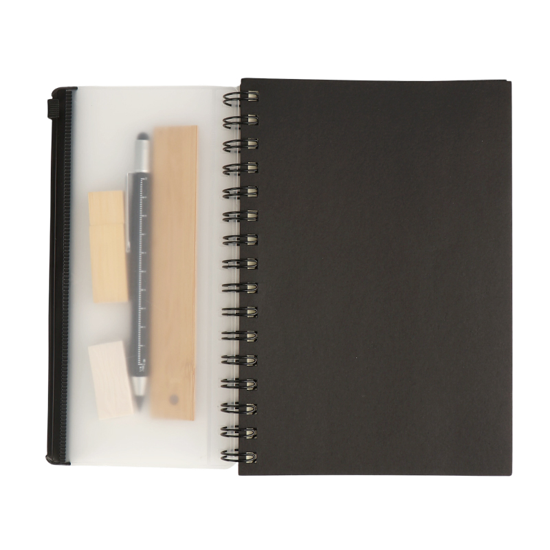 This A5 coil notebook features a 300g special paper cover with EVA pen case, 70 beige horizontal-printed sheets (70g), and black large metal double coils (1.8-2CM diameter). Supports color and logo customization.