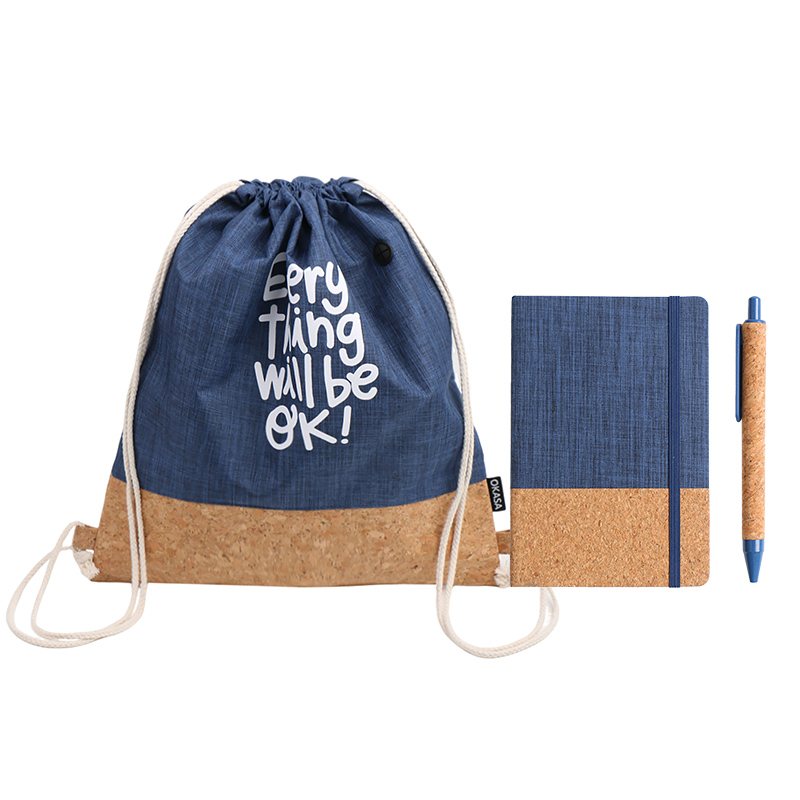 - Estilo: Uma caneta com corpo em cortiça e detalhes em azul, que complementa o design do caderno e da bolsa, criando um visual harmonioso e ecologicamente consciente.