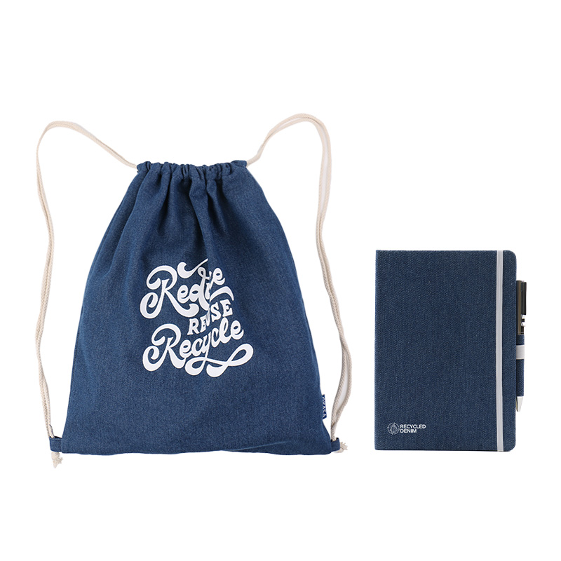 Este conjunto de presentes cuidadosamente selecionado apresenta dois itens principais, cada um confeccionado com jeans reciclado para enfatizar a sustentabilidade: