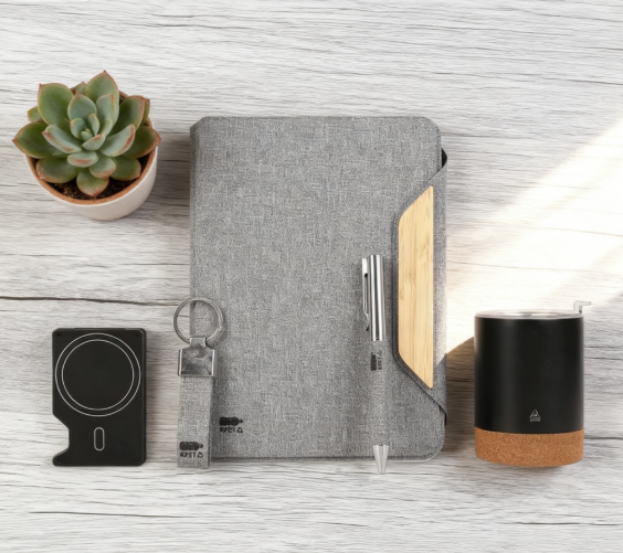 Роскошь переосмысливается благодаря осознанным инновациям и дизайну, ориентированному на человека . Мы сочетаем переработанный RPET, натуральный бамбук, пробку и передовые технологии алюминия, создавая набор, который выводит повседневные ритуалы на новый уровень — от записи заметок и поездок на работу до употребления воды и организации вещей. Каждый предмет сочетает в себе экологичность и интуитивно понятную функциональность, позволяя пользователям жить осознанно, оставаясь на связи, организованными и стильными. Это видение современного подарка, в котором гармонично сочетаются экологичность, технологии и элегантность.