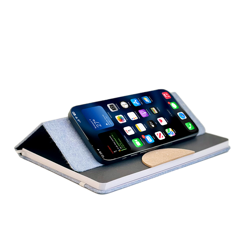 - Конструкция чехла : Чехол изготовлен из переработанной хлопковой ткани, закрепленной на сером картоне толщиной 1,5 мм. Он включает в себя полукруглый держатель для телефона (изготовленный из импортной переработанной искусственной кожи, также закрепленной на сером картоне), позволяющий удобно держать телефон, не оставляя рук, во время письма или просмотра контента.